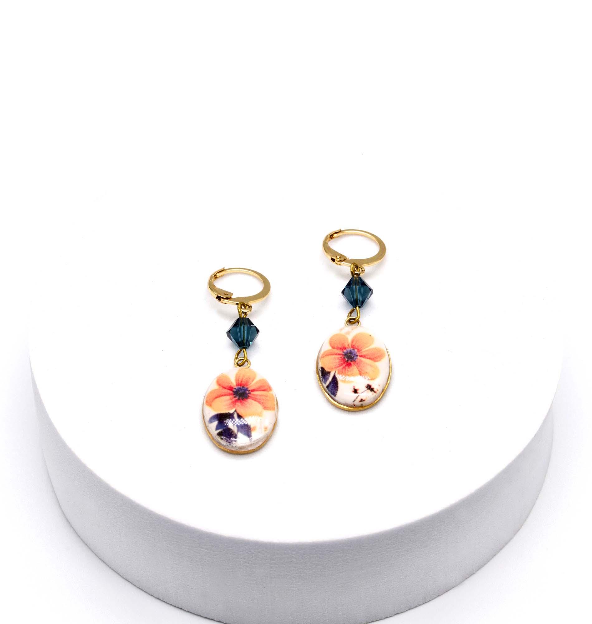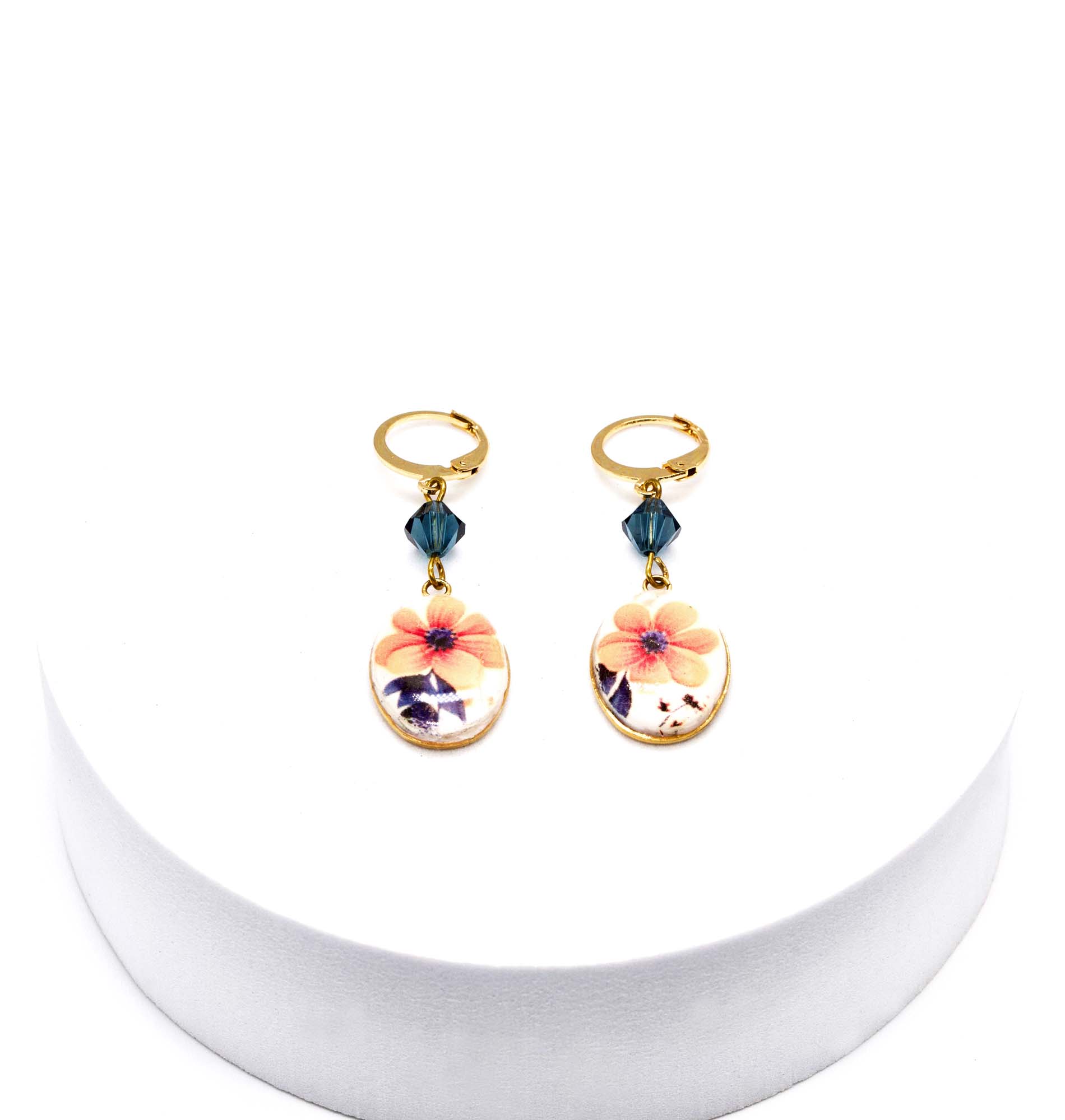 Ces boucles d’oreilles font la part belle aux fleurs dans des teintes modernes et tendres.