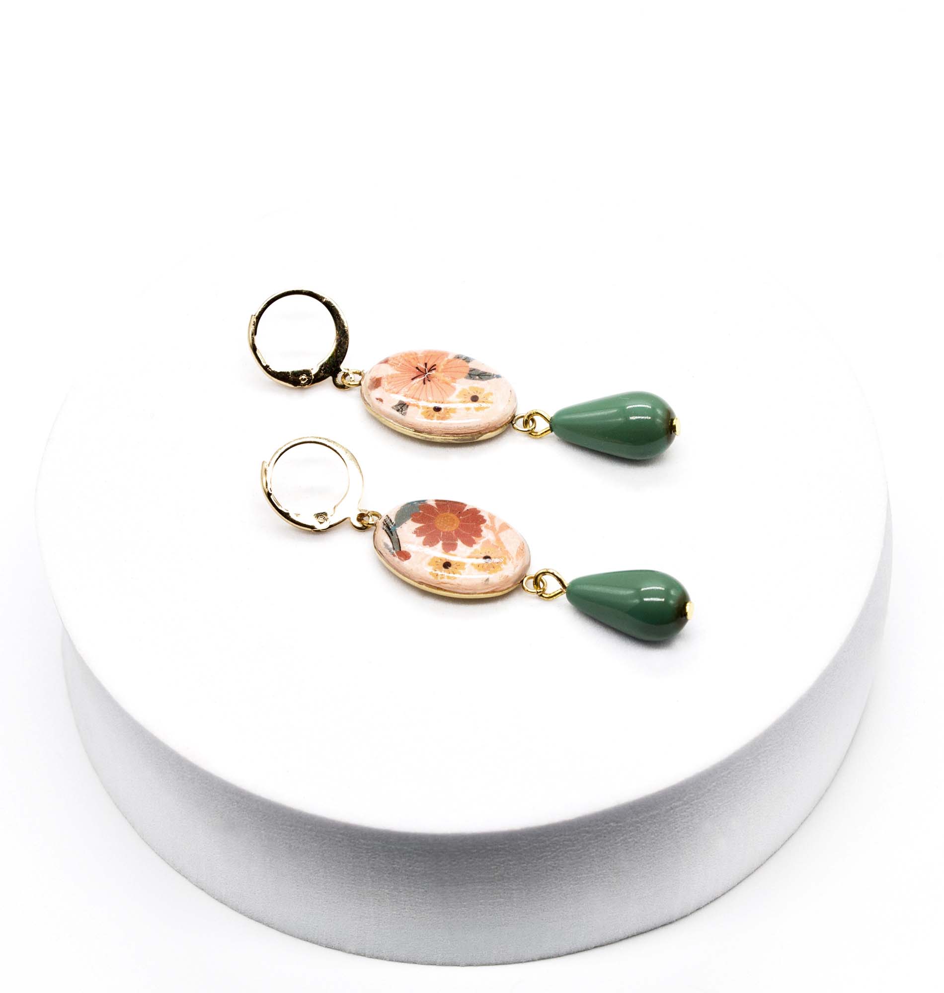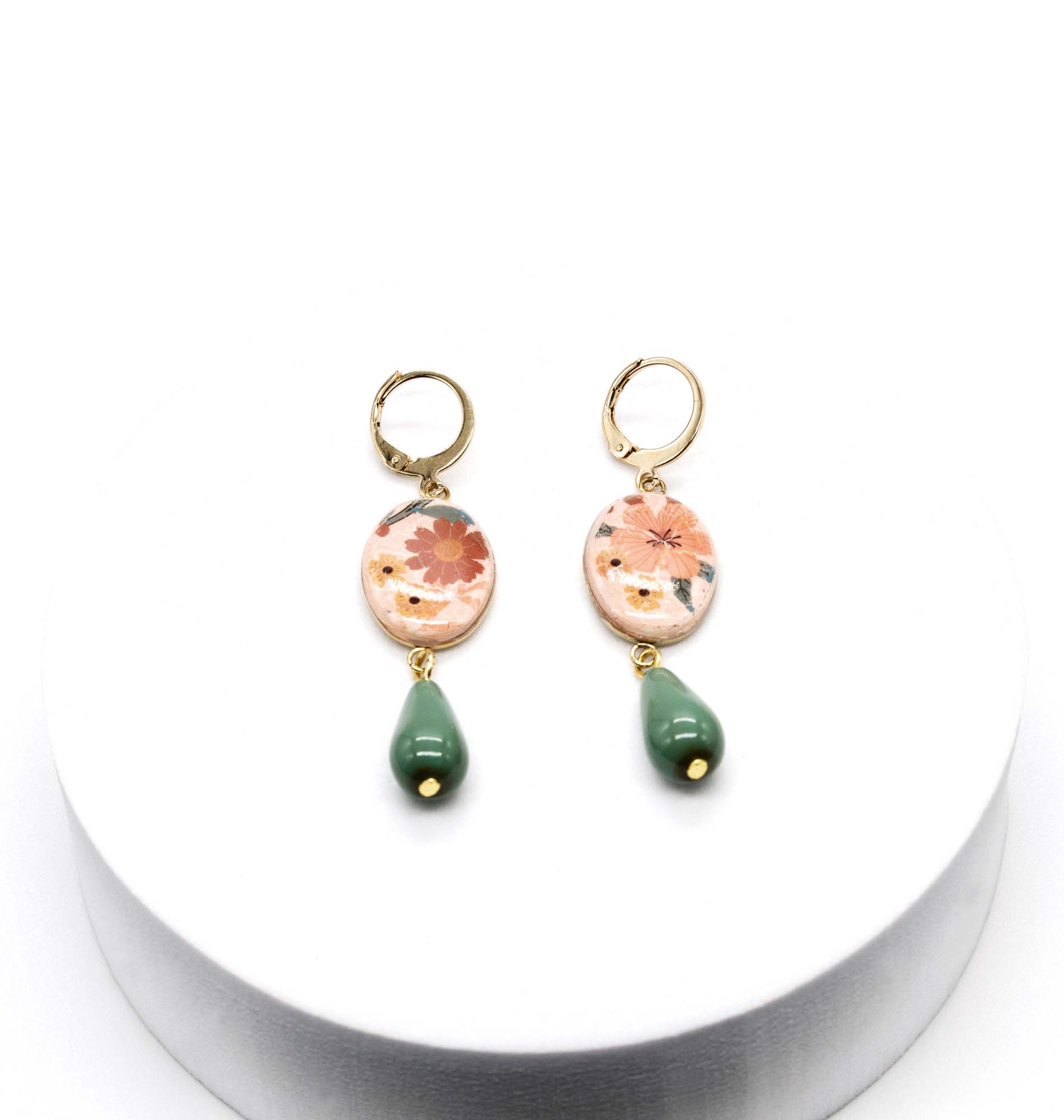 Ces boucles d’oreilles font la part belle aux fleurs dans des teintes modernes et tendres.
