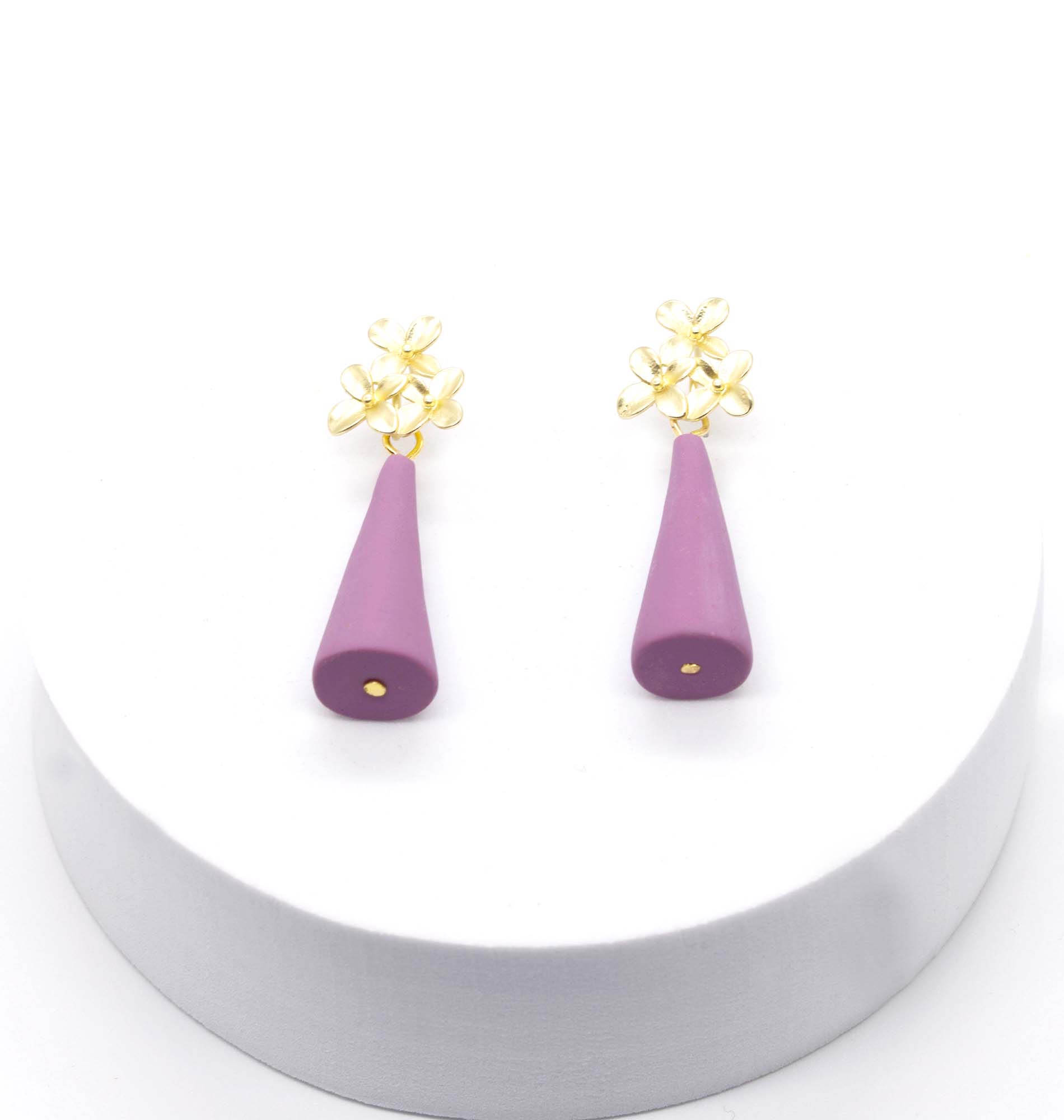 De petites fleurs dorées délicates qui soutiennent un pendentif lila conique : un contraste étonnant mais réussi.